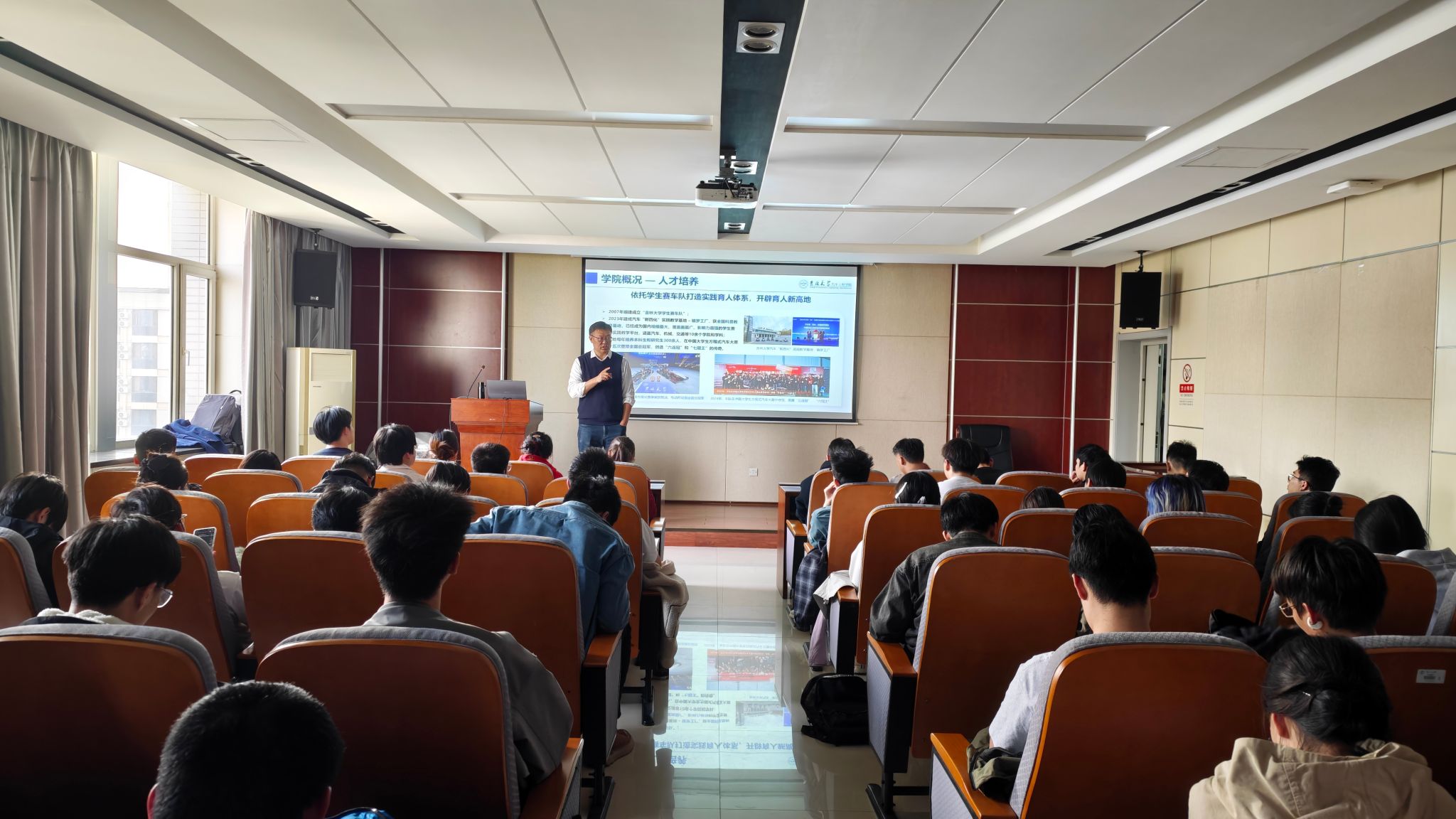 报告结束后,李明教授围绕欧洲杯 的研究生培养特色开展招生宣讲。他介绍了学院从学士到博士后的完整人才培养体系,重点解读了2026年车辆工程、动力工程及工程热物理等学科的招生计划、导师团队及科研方向,展示了学院在智能网联汽车、新能源汽车、集成式热管理系统等领域的科研平台与成果。